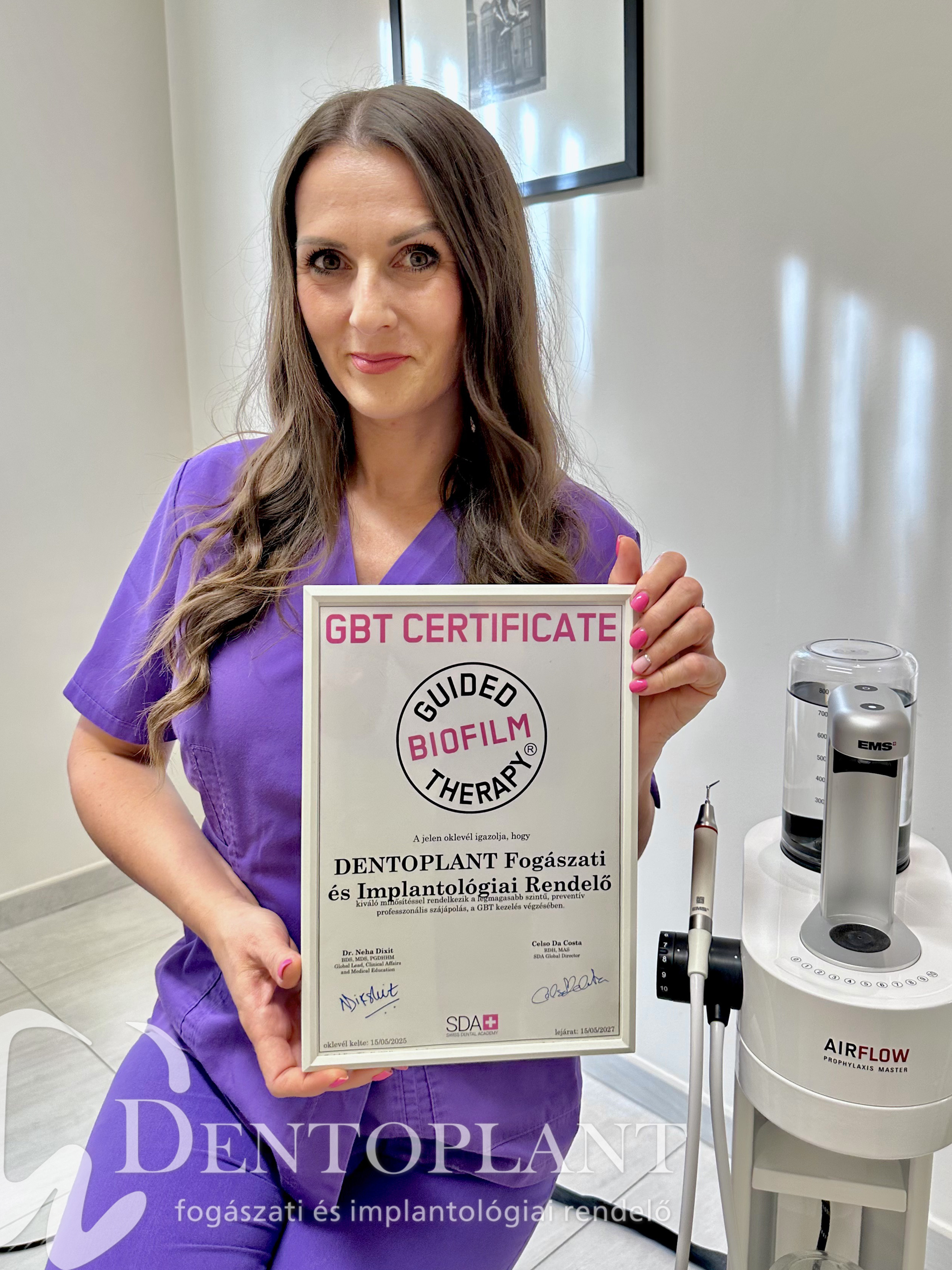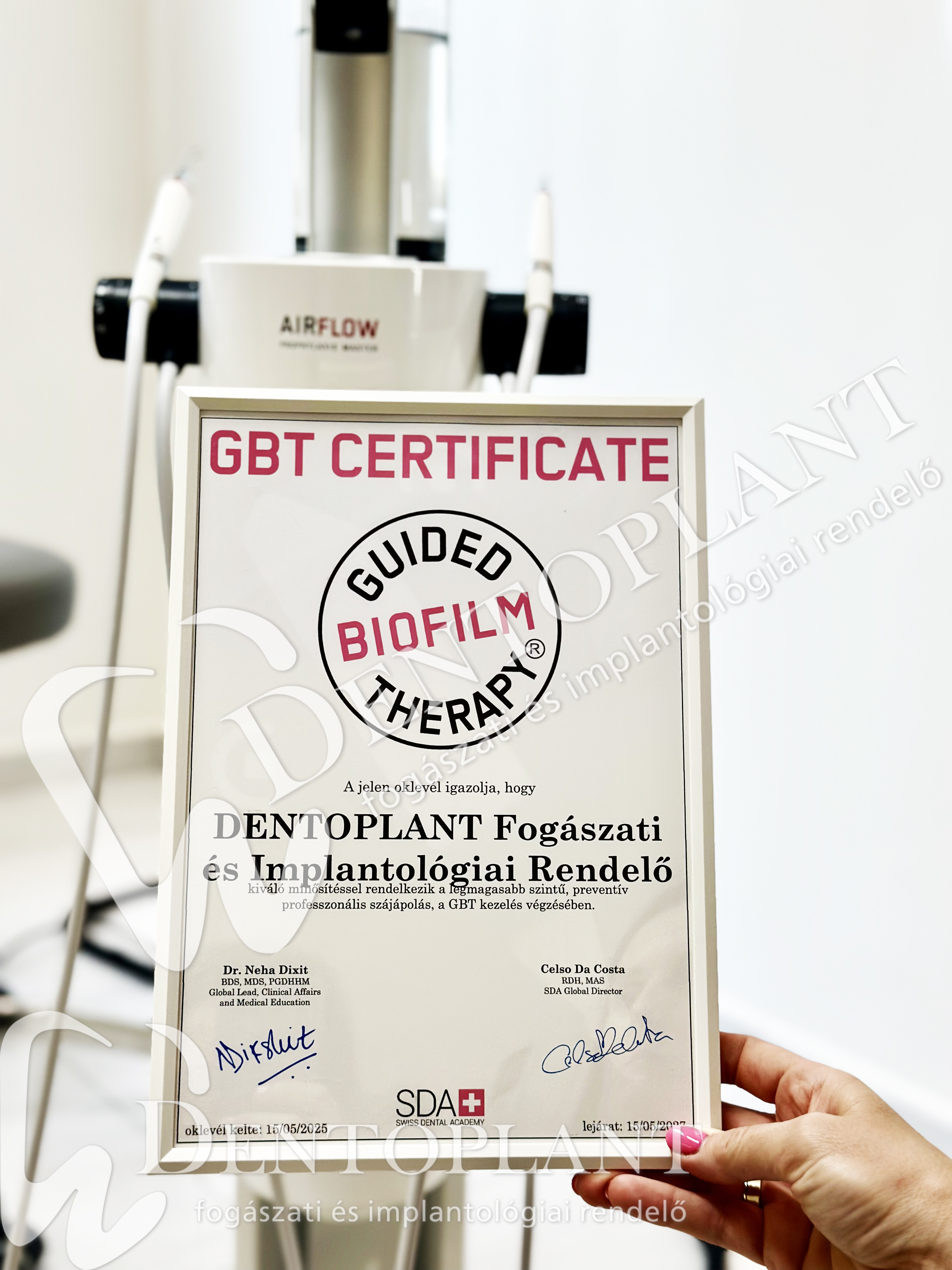 A “GBT tanúsítvány” a Guided Biofilm Therapy nevű, fogászati módszer alkalmazására vonatkozó igazolás, amely igazolja, hogy a tanúsítvány birtokosa sikeresen elvégezte a Svájci Fogászati Akadémia (Swiss Dental Academy) tanfolyamát és a hitelesítési eljárást követően megkapta a tanúsítványt. A GBT tanúsítvány azt jelzi, hogy milyen korszerű és átfogó megközelítést alkalmazunk a szájüregi egészség megőrzésében és a páciensek szájhigiéniás oktatásában.
